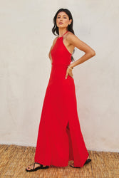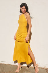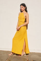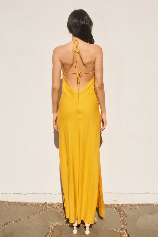 Our new Save The Date Maxi Dress is available in three colors- red, green, and marigold! This new arrival features a halter tie neckline, an open tie neckline, and a back zipper closure.