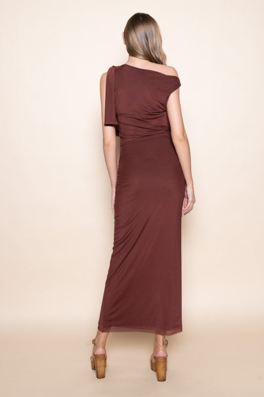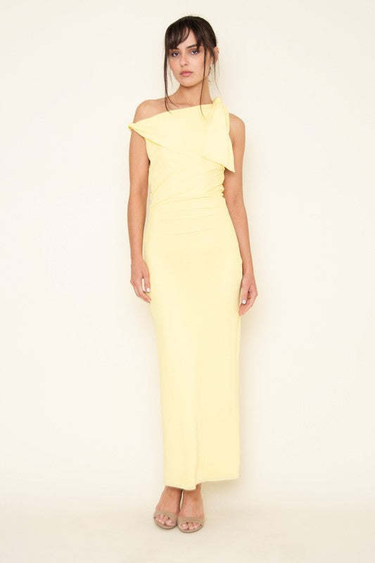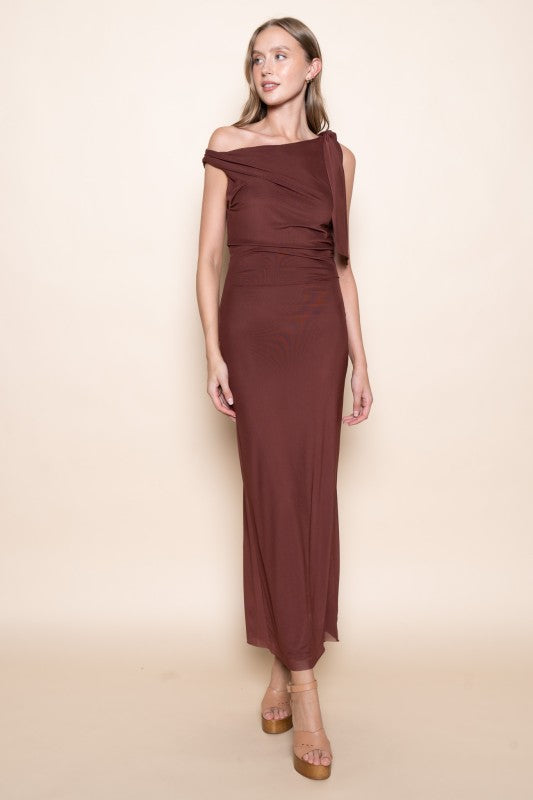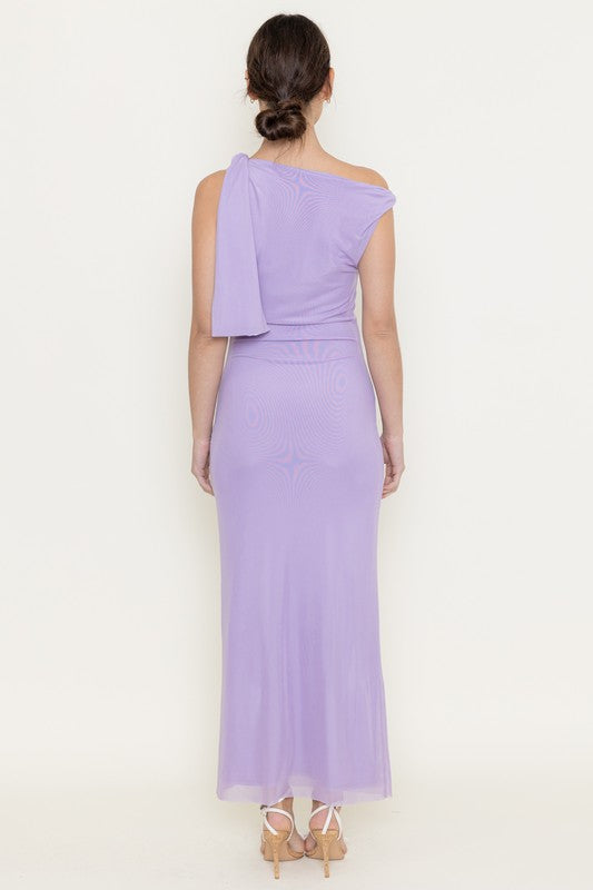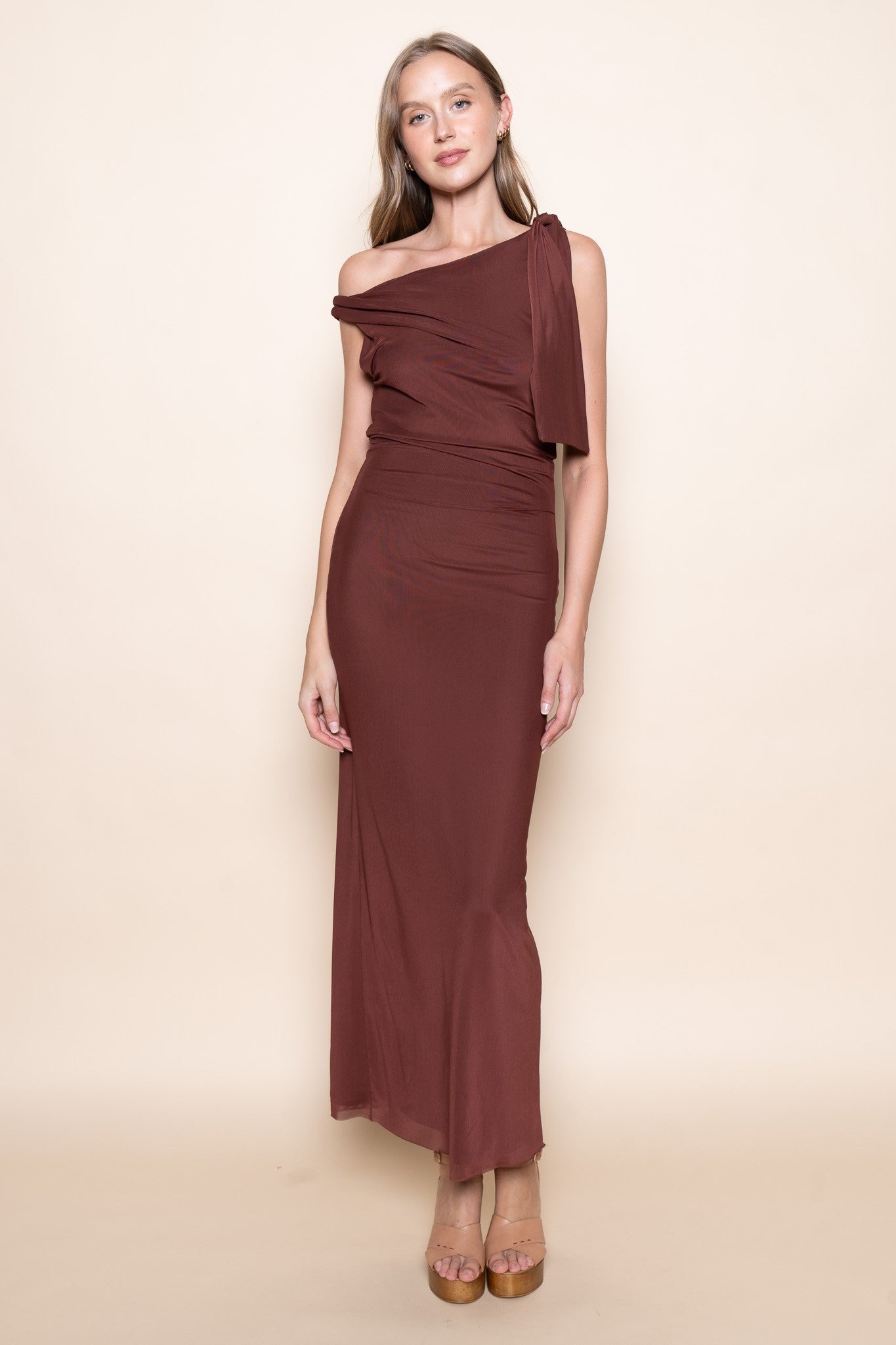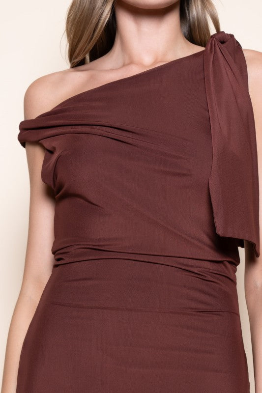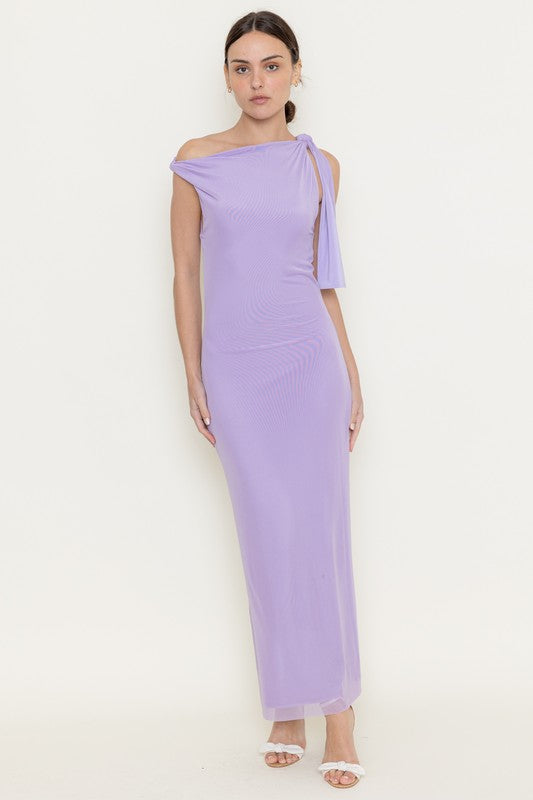 Turn heads at any event with our new Plus One Maxi Dress! This new arrival features an asymmetrical off the shoulder neckline, a tie strap, and ruched detailing. Available in lavender, yellow, and brown.