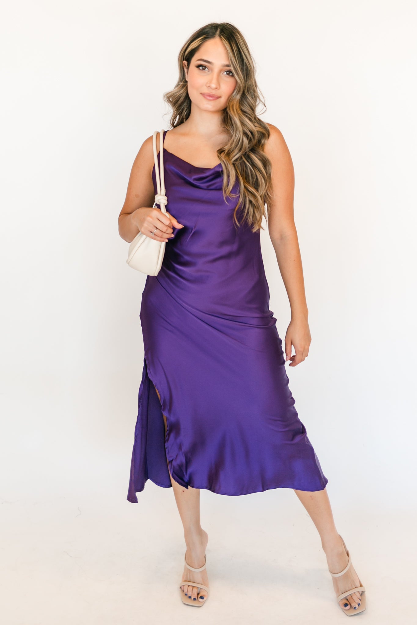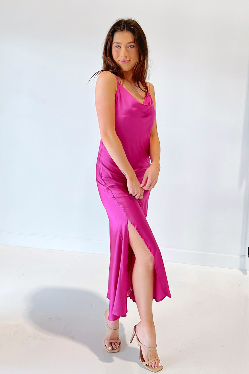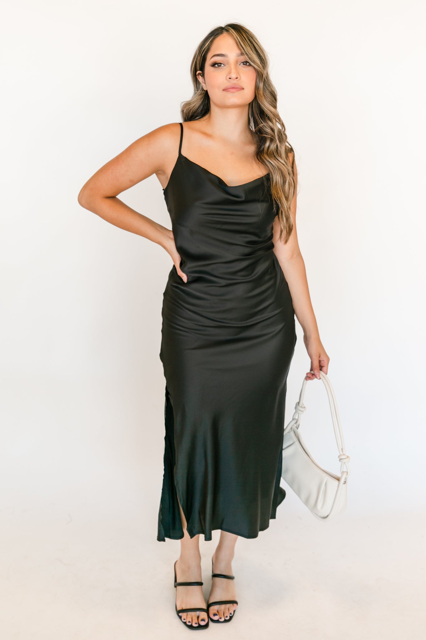 Sleek, silky, and effortlessly chic — the Remi Satin Midi Dress is your go-to for any elevated moment. Featuring a soft cowl neckline, adjustable straps, and a flattering midi length with a subtle side slit, this dress drapes beautifully in all the right places. The luxe satin finish gives it that perfect glow, making it ideal for date nights, weddings, or a dressed-up girls’ night.