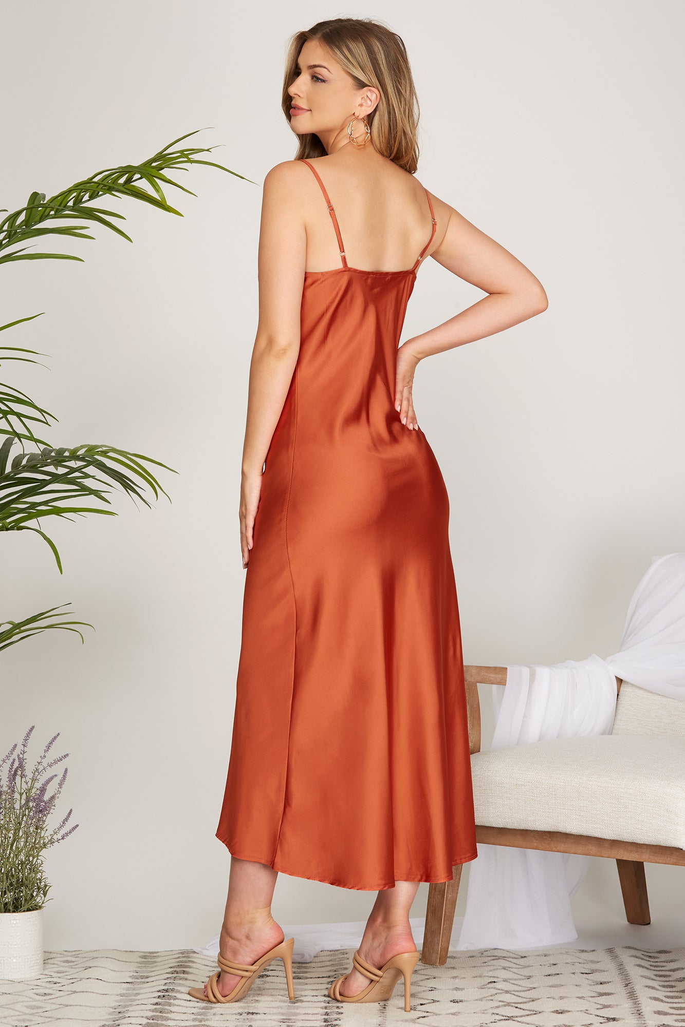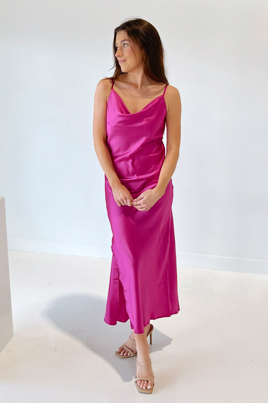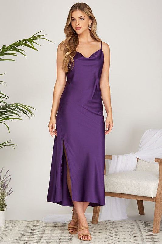 Sleek, silky, and effortlessly chic — the Remi Satin Midi Dress is your go-to for any elevated moment. Featuring a soft cowl neckline, adjustable straps, and a flattering midi length with a subtle side slit, this dress drapes beautifully in all the right places. The luxe satin finish gives it that perfect glow, making it ideal for date nights, weddings, or a dressed-up girls’ night.