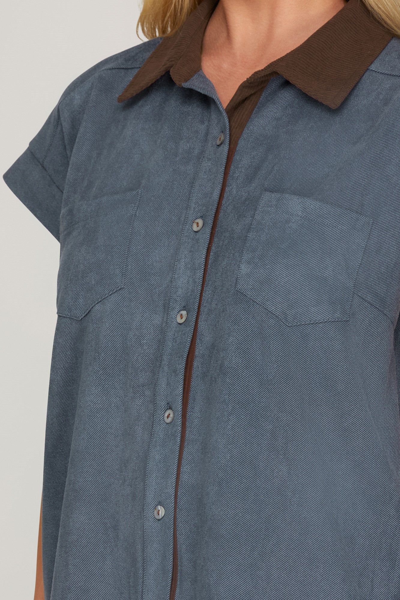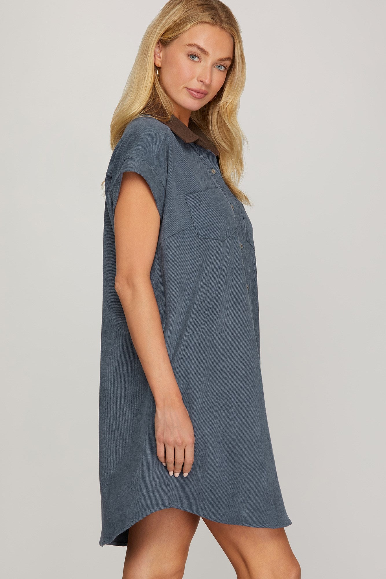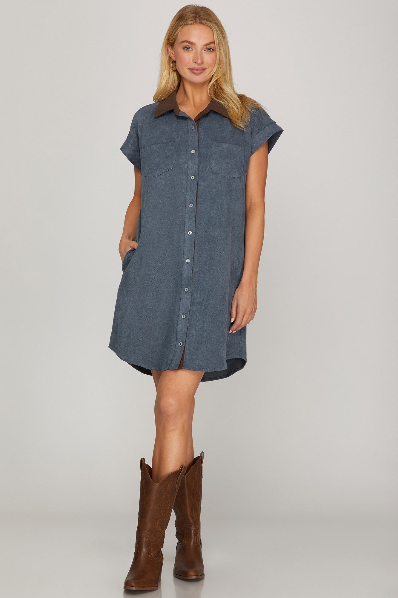 Our new Southern Suede Mini Dress is available in two colors- black and denim! This new arrival features a collared neckline, a button up closure, short sleeves, and side pockets. Perfect for the fall season!
