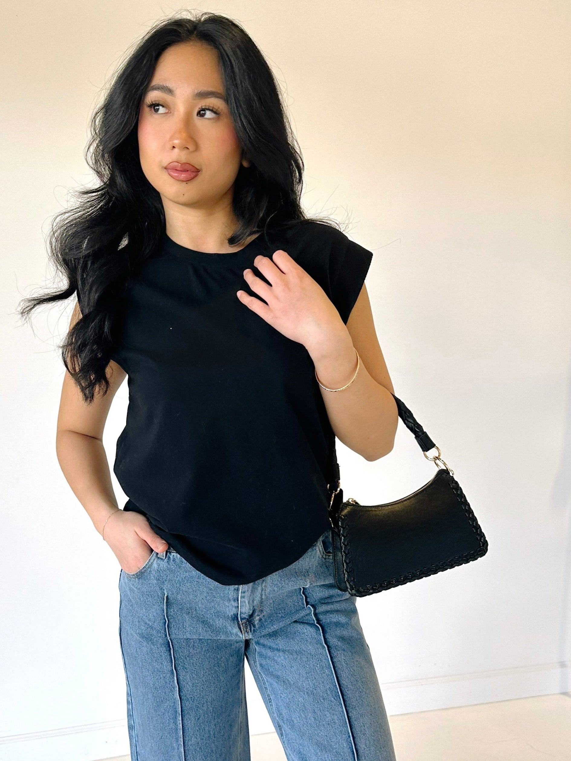 An elegant mini purse with braided detailing along top handle and outer frame. A touch of edginess to match its smooth vegan leather feel. Equipped with a detachable/adjustable long strap for crossbody wear option. Zipper opening and gold hardware detailing for a luxurious aesthetic. Classic shape for a perfect sized bag to feel comfortable taking around anywhere. Fits smaller daily essentials like headbands, hair clips, and sunglasses.