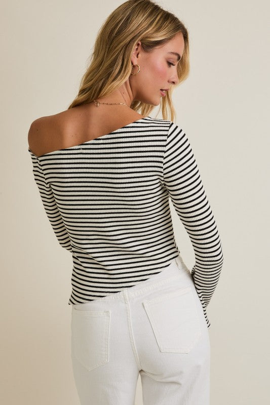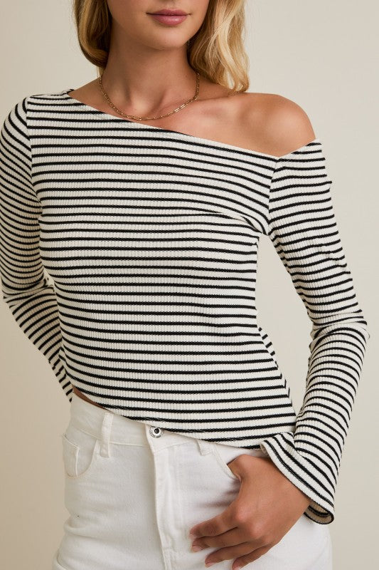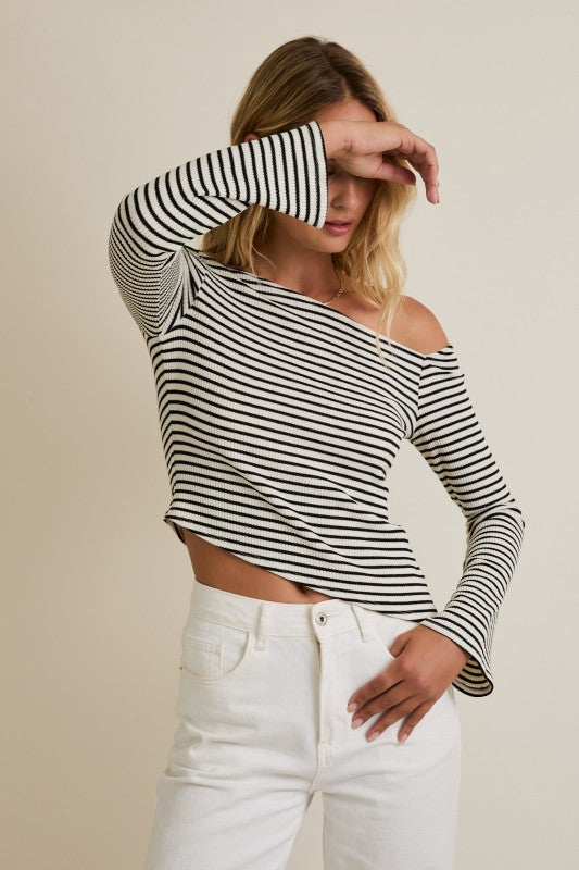 Our new Stella Striped Knit Top is definitely a must have for the fall season! This new arrival features a ribbed knit material, an asymmetrical neckline, long flared sleeves, and an asymmetrical hem. Available in black/ivory.