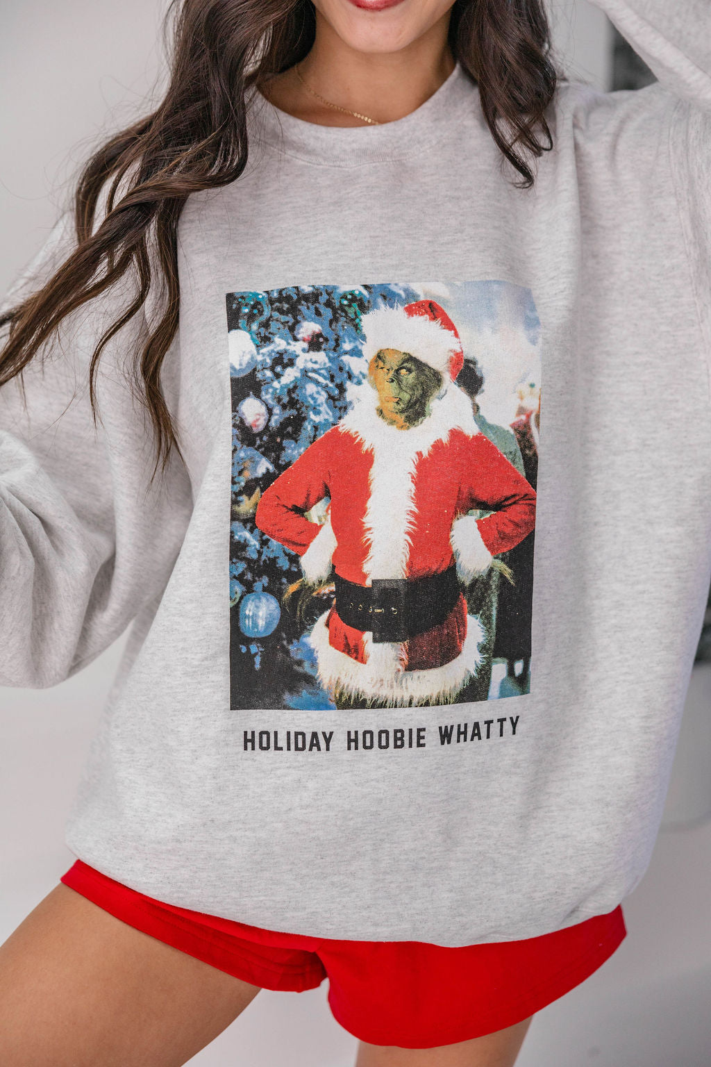 Celebrate the season with a little Grinchy mischief. This ash grey crewneck features the Grinch dressed as Santa with “Holiday Hoobie Whatty” across the front - a best seller year after year after year.