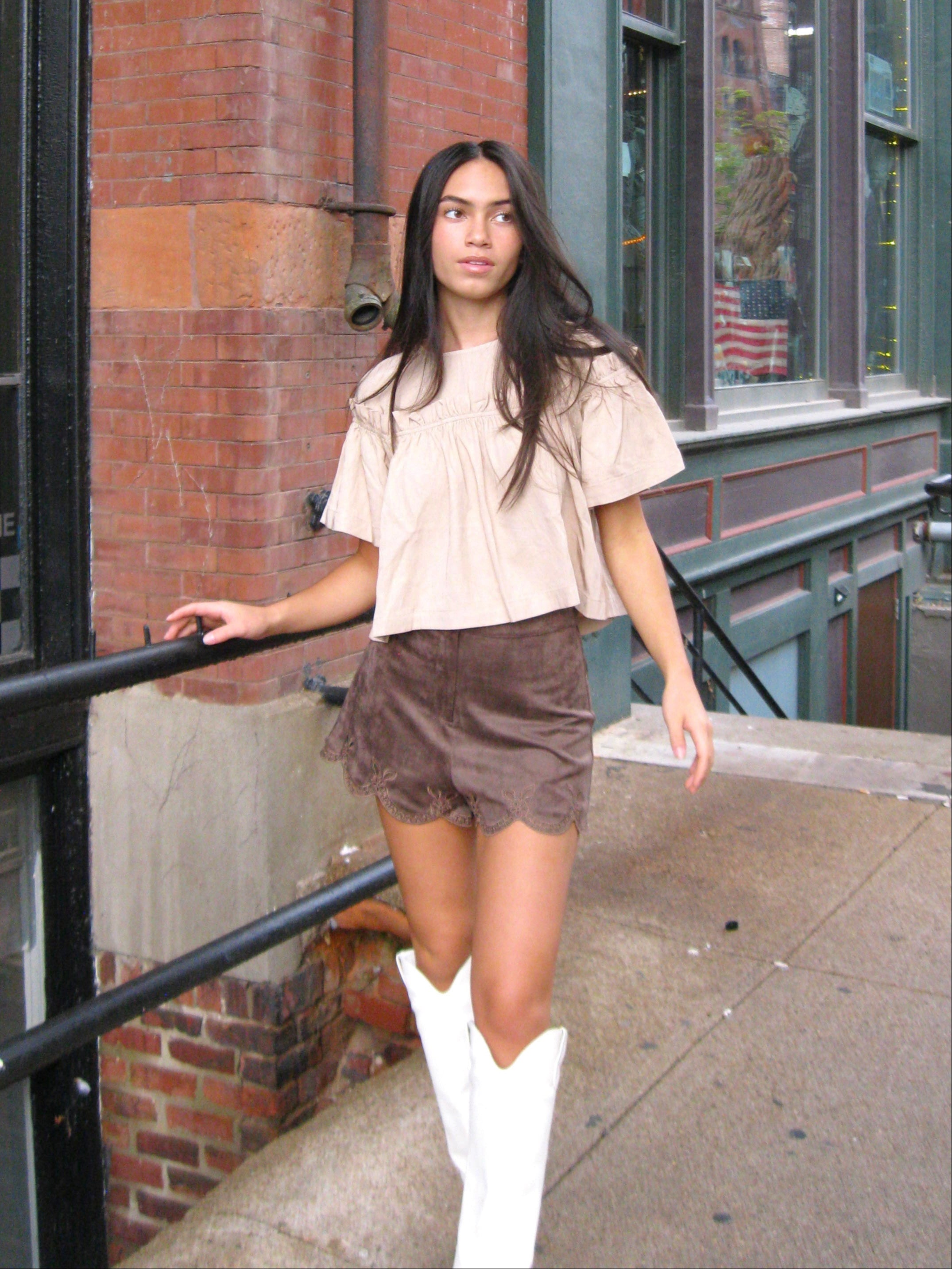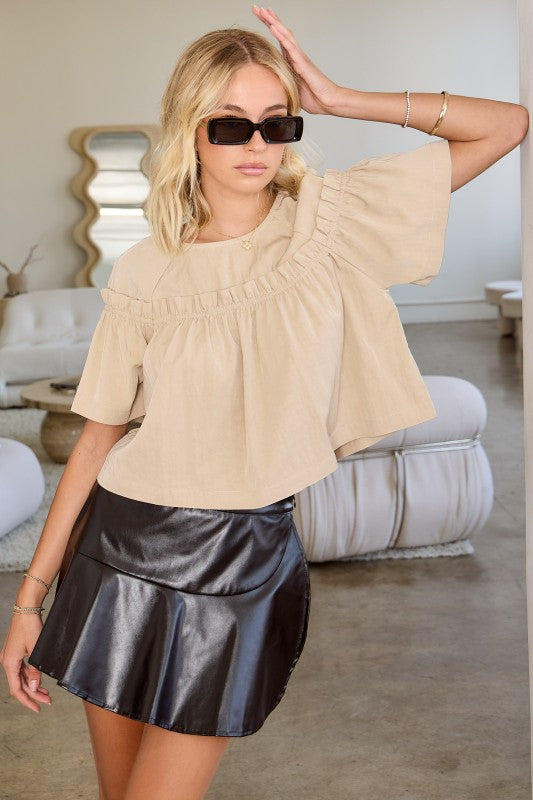 Our new Behind The Scenes Top is one you can pair with any bottoms! This new arrival features a round neckline, short sleeves, a slightly cropped length, and a back button closure. Available in taupe.