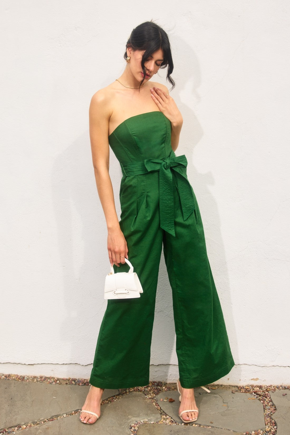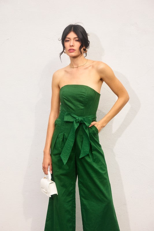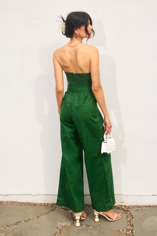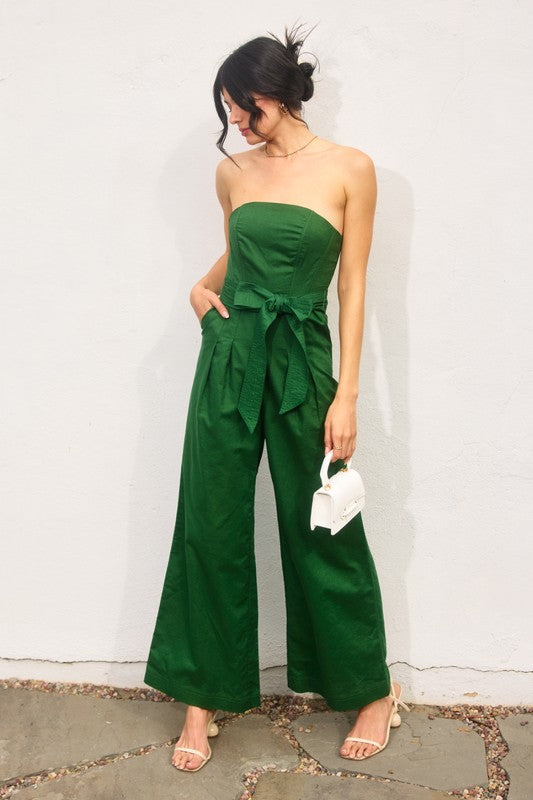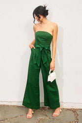 Our new Just Because Jumpsuit is available in three colors- navy, green, and brick! This new arrival features a strapless neckline, a belted tie waistband, side pockets, and a smocked back zipper closure.