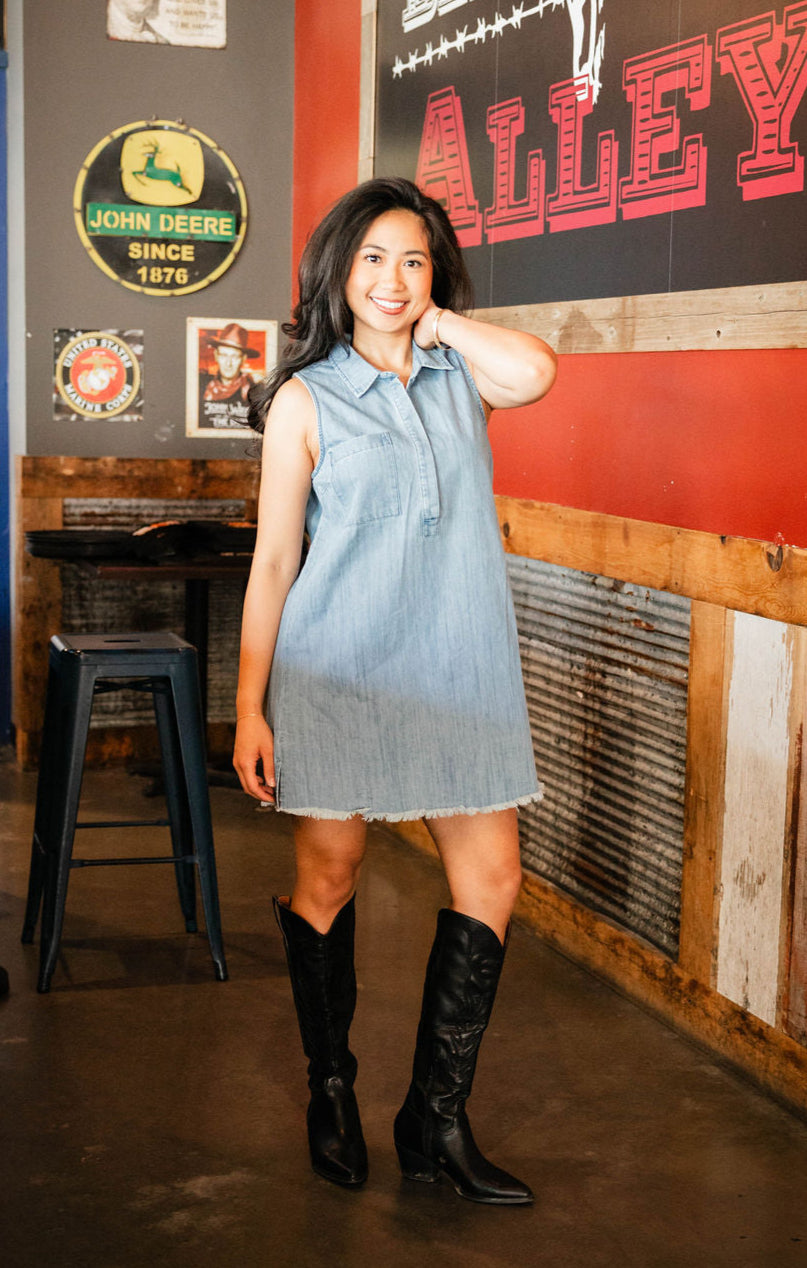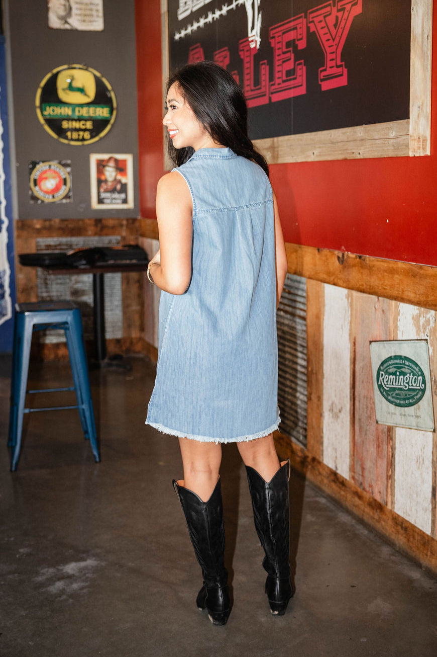 Our new Delilah Denim Mini Dress is an absolute must have for any occasion! This new arrival features a collared neckline, side pockets, and a distressed hem. Dress this one up or down with your favorite accessories!