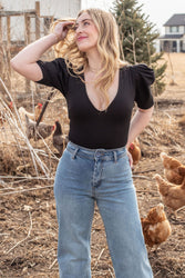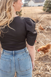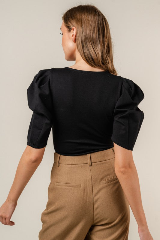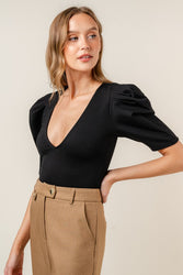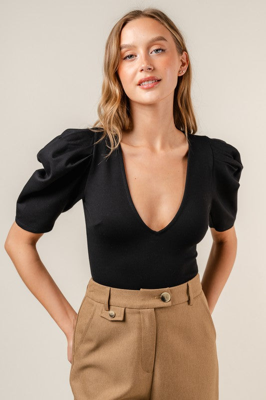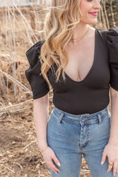 Our new Behind The Scenes Bodysuit is our new go-to going out top! This new arrival features a deep v-neckline, short puff sleeves, and a thong bottom with a snap button closure. Available in black.