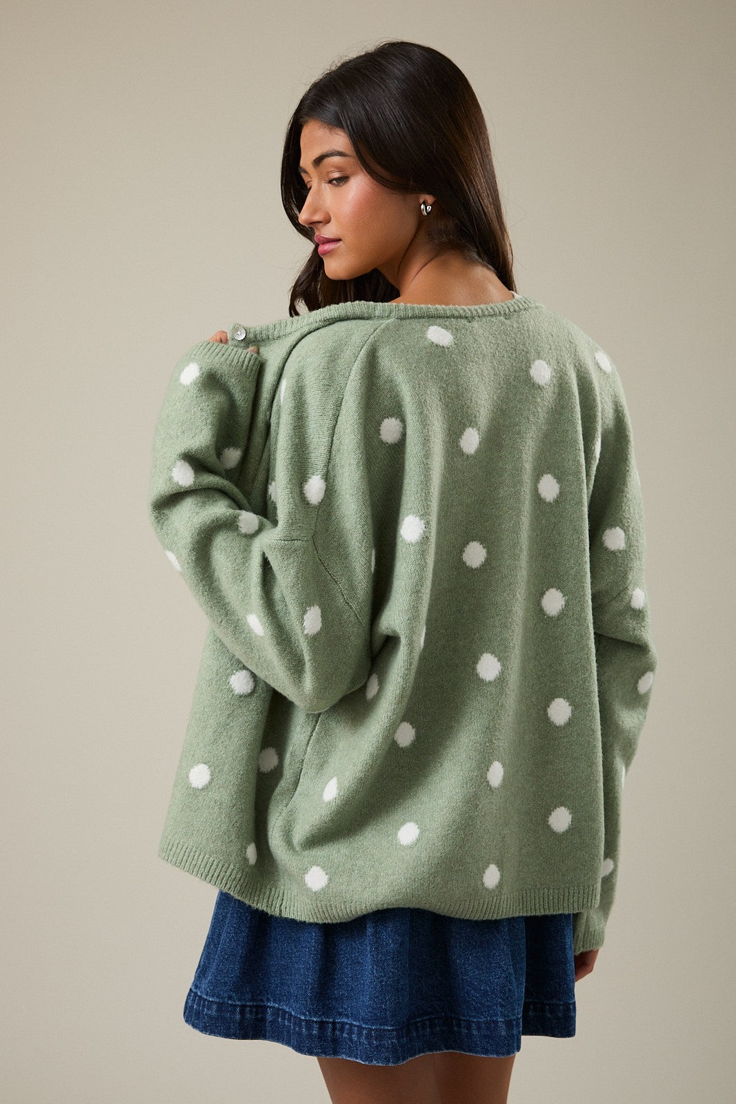 Wrap yourself in cozy charm with the Dottie Knit Cardigan! This delightful piece features a classic polka dot pattern that brings a touch of whimsy to any outfit. Crafted from soft, breathable knit fabric, it's perfect for layering on cool days or wearing solo when the weather's mild. The relaxed fit and button-front design make it effortlessly versatile—dress it up with a skirt or keep it casual with your favorite jeans. A wardrobe essential that proves dots are always in style!