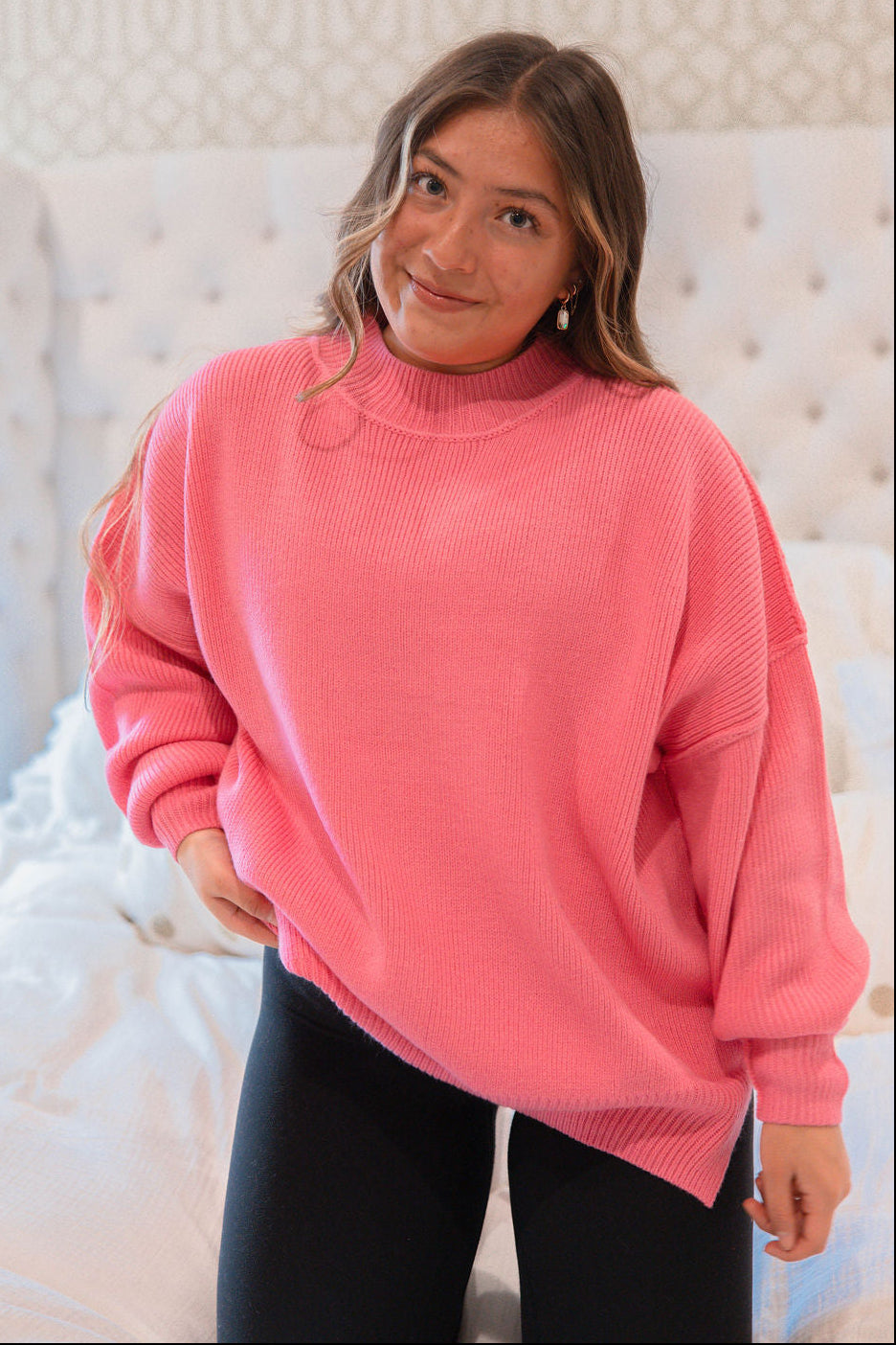 Back for another season!! Our Hillary Knit Sweater is now available in blue, green, pink, red, magenta, berry, lavender, indigo, navy, and hunter green! This new arrival features a mock neckline, drop shoulders, long sleeves, and a relaxed fit.
