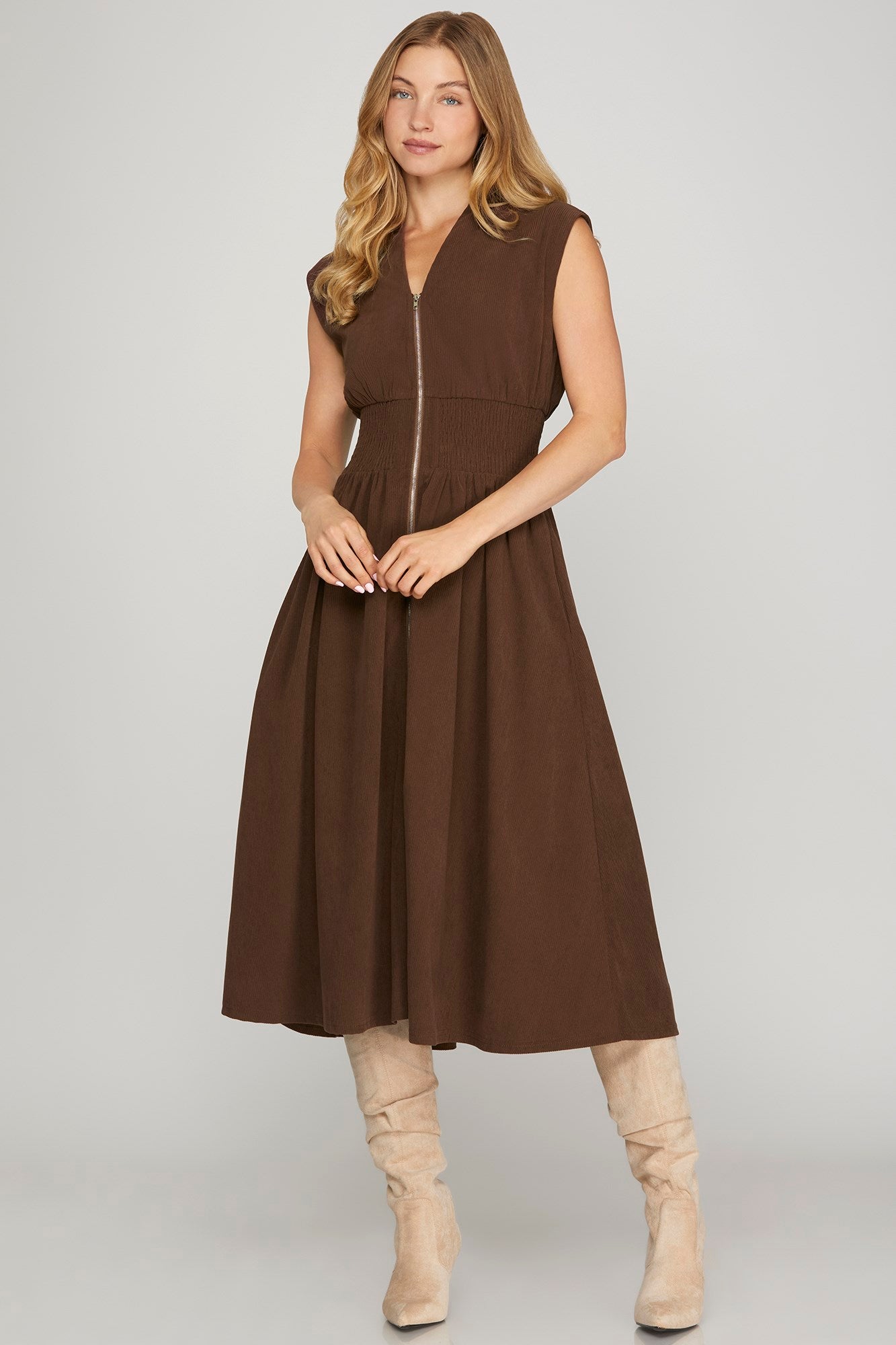 Our new Hazel Corduroy Midi Dress is available in three colors- brown, blue, and olive! This new arrival features a v-neckline, a zipper closure, and a smocked waistband. Perfect for the start of the fall season!