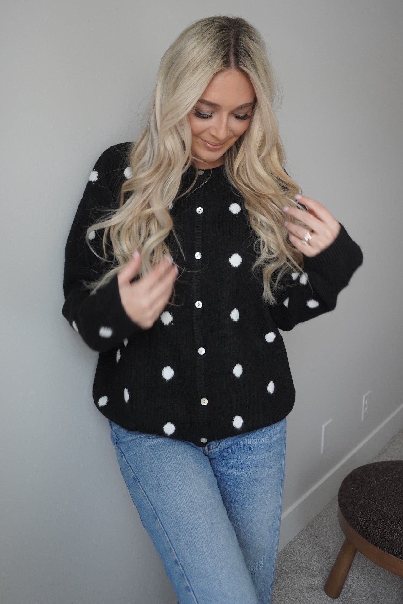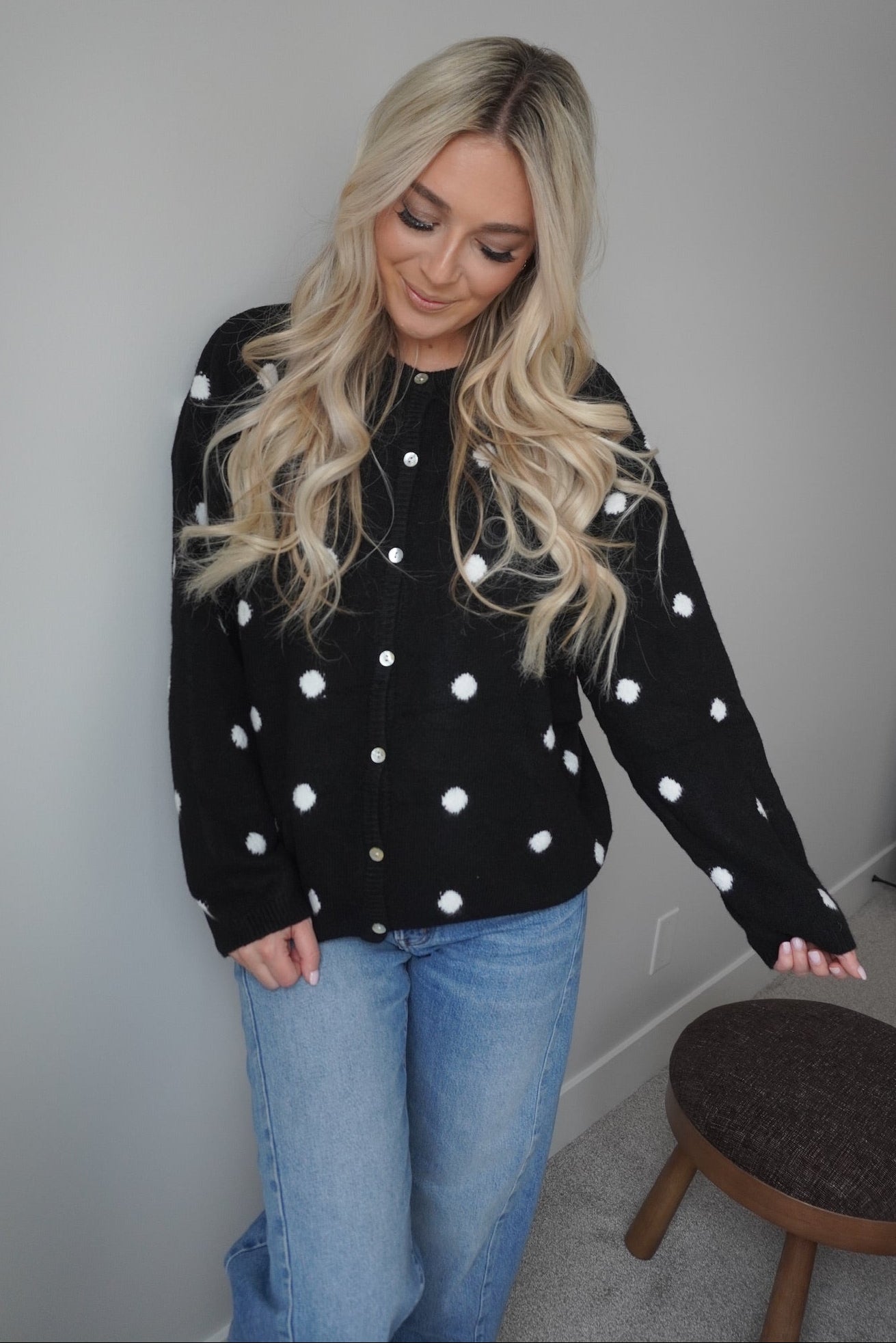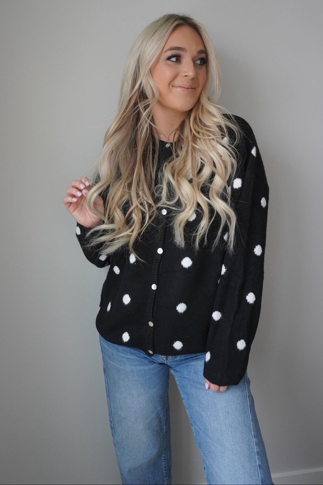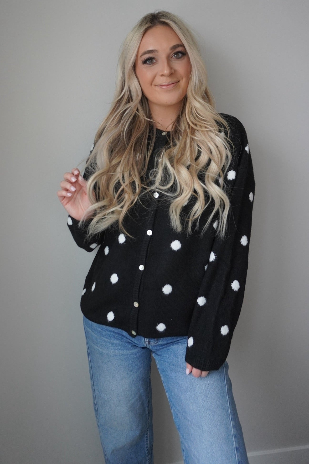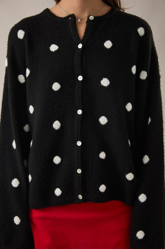 Wrap yourself in cozy charm with the Dottie Knit Cardigan! This delightful piece features a classic polka dot pattern that brings a touch of whimsy to any outfit. Crafted from soft, breathable knit fabric, it's perfect for layering on cool days or wearing solo when the weather's mild. The relaxed fit and button-front design make it effortlessly versatile—dress it up with a skirt or keep it casual with your favorite jeans. A wardrobe essential that proves dots are always in style!