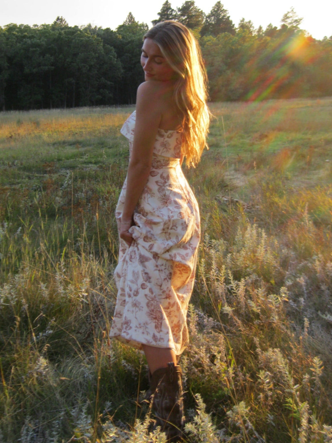 Celebrate any fall occasion with our new Prairie Rose Midi Dress! This new arrival features a stunning floral print, a strapless neckline, and a back zipper closure. Dress this one up with any of your favorite accessories!
