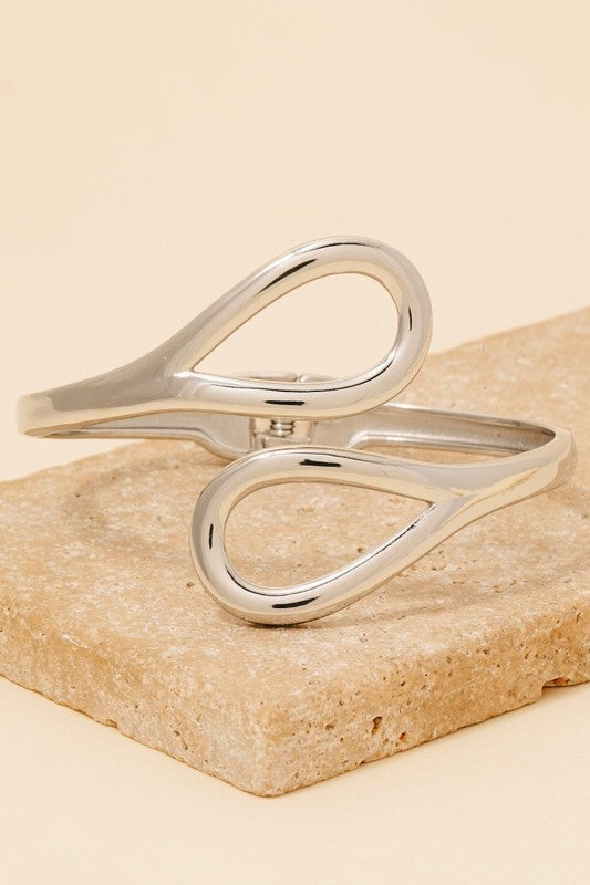 Stainless steel teardrop loops hinge bangle bracelet. Available in gold and silver.