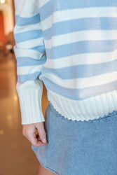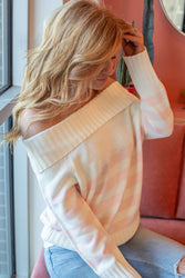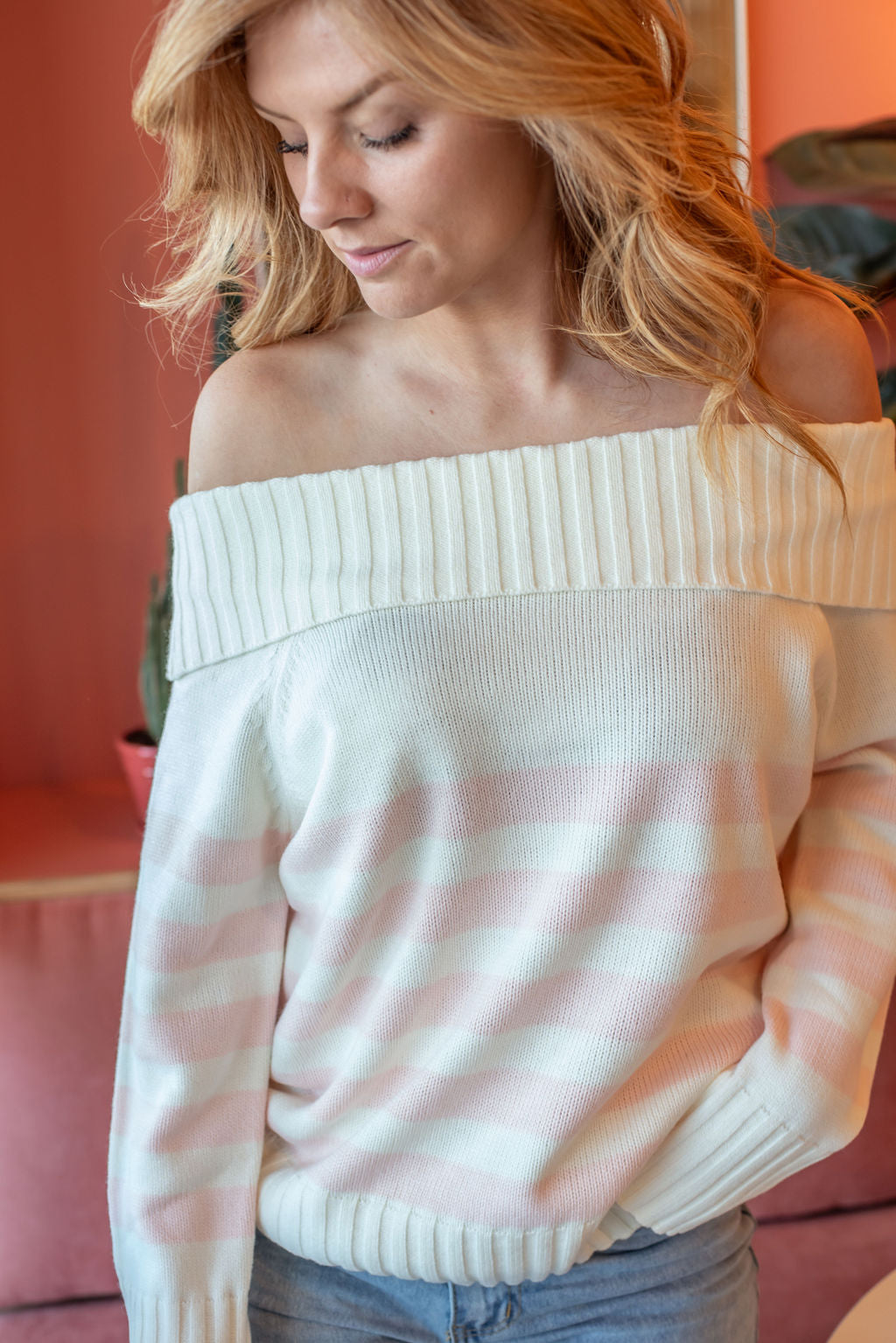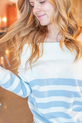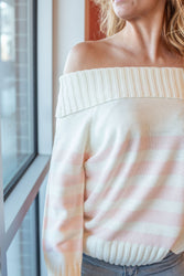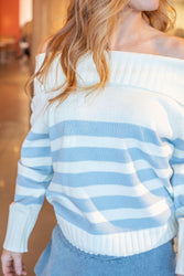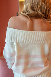 Our new Winter Striped Sweater is perfect for the season transition! This new arrival features an off the shoulder neckline, long sleeves, and a full length. Pair this one with your favorite denim! Available in light blue and pink.